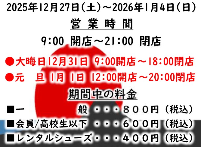 | 2025/12/25 | 年末年始営業時間 ゲーム料金等のお知らせ ![]() |